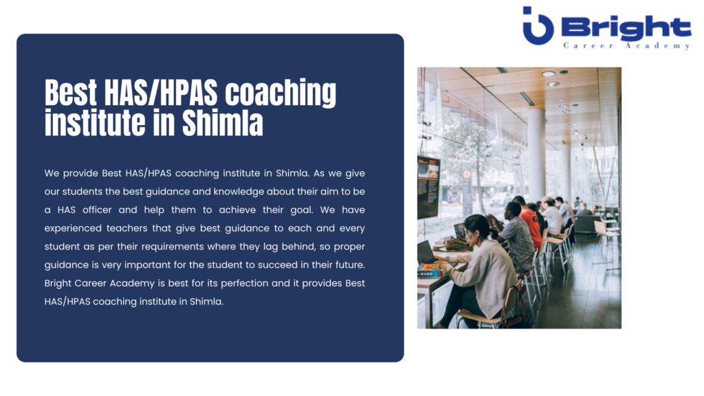 Bright career academy is Best HAS Coaching institute n Himachal. It helps you to clear your HAS exam with HAS coaching in Himachal. We provide best HAS coaching in all the districts like HAS coaching in Kullu Himachal Pradesh, HPAS coaching in Shimla. Therefore the Best coaching institute for HPAS in Shimla is Bright career academy. We have expert teachers and faculties, and we organize regular mock test series. The best HPAS coaching institutes in Shimla is Bright Career Academy.